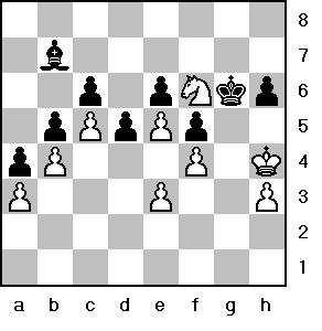 46. Ng8 Kg7 47. Kh5! Kxg8 48. Kxh6 Bc8 ?? Die kompliziertere Hauptvariante ist 48....Kf7 49.Kg5. Weiß opfert den h-Bauern und verfolgt den Läufer, dabei erreicht er zumindest ein vorteilhaftes, wahrscheinlich gewonnenes Damenendspiel. Auf der Bewegungslosigkeit des L beruht das Figurenopfer. 49. Kg6 Bd7 50. Kf6 Kf8 51. h4 Be8 52. Kxe6 Bg6 53.Kf6 Bh7 54. e6 Ke8 55. Kg7 1:0