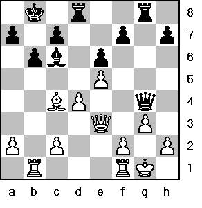 Mit einem Mehrbauern hat Weiß hier etwas sorglos gespielt. d4 sollte jetzt mit 1.f4 (!) geschützt werden. Weiß befürchtete 1....Dh3 2.Tf2 T:d4 ? (2.D:d4?? T:g3+), was aber durch 3.Lf1! widerlegt wird. Deshalb läßt Weiß "Dauerschach" zu ...