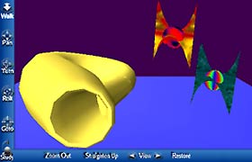 Dank der 3D-Beschreibungssprache VRML (Virtual Reality Modelling Language) lassen sich dreidimensionale Szenen auch interaktiv erkunden - "durchwandern" bzw. "durchfliegen", die Szene läßt sich drehen und von allen Seiten betrachten. Allerdings ist die Qualität der Bilddarstellung dabei nicht so hoch wie bei der Verwendung eines RayTracing-Programms zum Rendern dreidimensionaler Szenen - kein Wunder: die Bewegung soll in "Echtzeit" stattfinden und der Computer muß in jeder Sekunde mehrere Bilder berechnen. Ich habe eine interaktive dreidimensionale Szene erstellt, welche dieselben mathematischen Objekte enthält wie das Bild auf der Startseite.